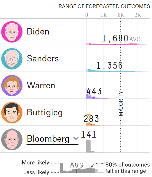 A ce stade de la course, le site fivethirtyeight prévoit un résultat indécis où aucun candidat ne parviendrait à atteindre cette barre fatidique des 1990 délégués. Toutefois, on voit bien que seuls Biden et Sanders devraient être en mesure d’atteindre ou de frôler ce chiffre.