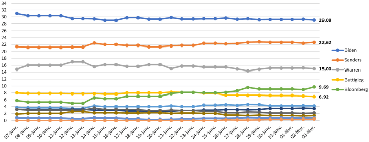 Dans tous ces groupes, 5 candidats se détachent soit dans les sondages nationaux, soit dans les premiers états appelés aux urnes. Biden fait la course en tête dans les sondages nationaux et les états les plus conservateurs, Sanders est le leader de l’aile gauche et a une dynamique très forte dans les 3 premiers états qui votent, Warren est en 3ème position dans l’ensemble des sondages et Buttigieg est très haut dans l’Iowa. Enfin, Bloomberg est en embuscade et attend le Super Tuesday du 3 mars pour entrer dans la danse et remporter la mise à la dernière minute.