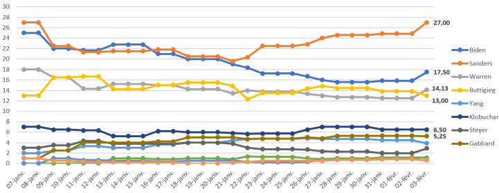 En ce qui concerne les premières élections en Iowa et au New Hampshire, c’est Sanders qui prend le dessus plus ou moins largement. Toutefois, Warren et Buttigieg pourraient créer la surprise en Iowa. Quant à Biden, une victoire dès l’Iowa ou le New Hampshire pourrait sonner le glas des ambitions de tous les autres.