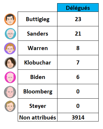 La faiblesse des 2 poursuivants directs de Sanders et la grande détresse des campagnes de Warren et Biden me laissent penser que Bernie Sanders est bien en position de force aujourd’hui. Au rendez-vous des 2 premiers scrutins, il profite de sa notoriété acquise en 2016 contre Hillary Clinton pour attirer un peu plus d’électeurs sur son nom que tous les autres. Pour autant, on ne peut pas encore parler de moment Bernie : le candidat peine à mobiliser toutes ses troupes de 2016 dans les urnes et aucun de ses concurrents n’est encore formellement éliminé. Il semble être le seul candidat capable de remporter des délégués partout, mais peut-être pas suffisamment pour éviter une convention contestée en juillet.