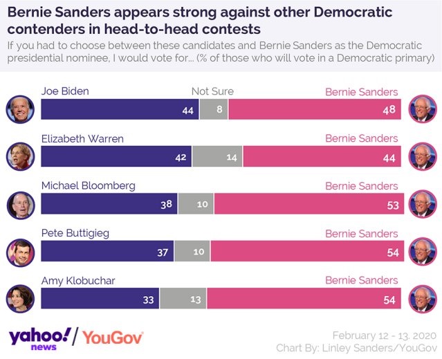 Le calcul paraît clair : les modérés sont en position de force face à Sanders s’ils parviennent à s’unir. On se rappelle en 2016 que Trump avait profité des divisions entre candidats républicains pour rapidement prendre les devants. Oui mais voilà, même si les 2 camps du parti donnent parfois l’impression d’être irréconciliables idéologiquement, beaucoup d’électeurs ne s’embarrassent pas pour passer d’un camp à l’autre. En effet, la personnalité des candidats joue beaucoup dans le choix et Sanders se retrouve souvent être le second choix des militants si leur candidat préféré venait à se retirer. Un sondage Yougov a testé des duels de Sanders contre chacun des candidats de l’aile droite et il se trouve qu’il l’emporte de manière assez large à chaque fois : 48% vs 44% face à Biden, 53% vs 38% face à Bloomberg, 54% vs 37% contre Buttigieg et 54% vs 33% contre Klobuchar.