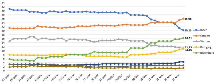 - 4 candidats à la droite du parti : Bloomberg, Biden, Buttigieg et Klobuchar qui se partagent 59% des intentions de vote