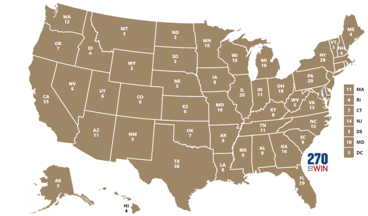 La répartition du collège électoral évolue tous les 10 ans suite au recensement de la population qui prend en compte l’évolution de la démographie dans le pays. 2020 est la dernière élection du cycle basé sur la démographie de l’an 2010. La carte évoluera en 2024.