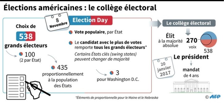 Ce collège de 538 électeurs correspond au nombre d’élus au Congrès, à savoir 100 sénateurs (2 par Etat) et 435 députés répartis proportionnellement selon le nombre d’habitants par Etat. A cela, il faut ajouter les 3 grands électeurs du District of Columbia. Il ne faut pas confondre ces élus avec les élus de la Chambre des représentants et du Sénat. Effectivement, le même jour la chambre est renouvelée entièrement mais les candidats sont sur une autre liste. 1/3 du Sénat est également renouvelé ce jour-là et il peut même se tenir une élection d’un gouverneur de l’Etat ou bien un référendum local. Ceci explique pourquoi on peut voir des queues énormes devant les bureaux de vote le jour J et que certains ne parviennent pas à voter…