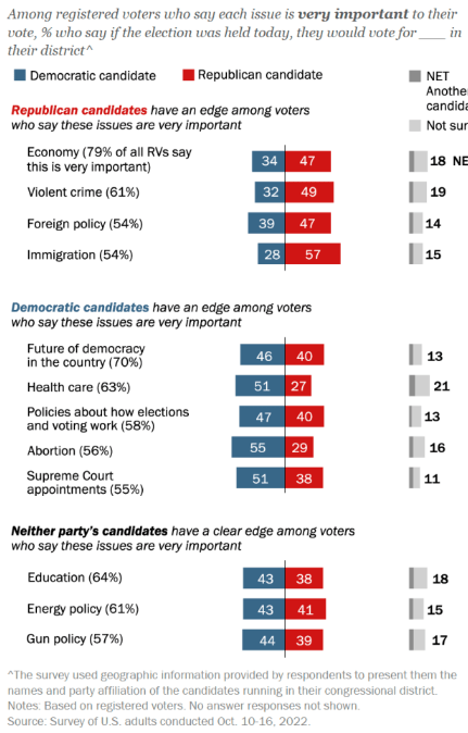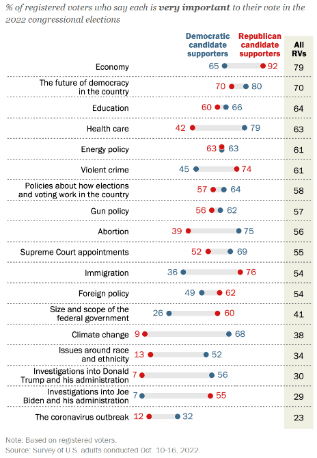 Maintenant que vous êtes bien équipés pour comprendre les élections de mi-mandat, abordons les enjeux qui occupent l’esprit des électeurs américains. Avec le conflit russo-ukrainien et la sortie de crise sanitaire, les Etats-Unis subissent, comme l’Europe, une forte inflation depuis quelques mois. D’après un sondage de l’institut Pew Research Center, l’économie est le premier sujet de préoccupation évoqué par 79% des électeurs (65% des sympathisants démocrates et 92% des sympathisants républicains). Quand on rentre dans le détail, c’est l’augmentation des prix des produits alimentaires et de consommation mais aussi des prix de l’essence et de l’énergie qui inquiètent le plus les futurs votants (73% et 69% des électeurs s’en inquiètent). Le coût de l’immobilier est également une priorité aux yeux des électeurs. Les américains sont en comparaison bien moins inquiets en ce qui concerne l’emploi puisque la fin du covid a marqué le retour au plein emploi avec un taux de chômage équivalent à celui de février 2020 (3,5%).