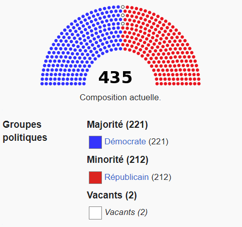 La chambre des Représentants est l’une des deux chambres du Congrès Américain, avec le Sénat, qui se partage le pouvoir législatif. Elle est composée de 435 représentants répartis sur l’ensemble des 50 états et élus pour un mandat de 2 ans. Le district de Columbia et les différents territoires américains comme Puerto Rico ont chacun 1 représentant qui n’a pas le droit de vote à la chambre. Pour disposer de la majorité absolue, un parti doit obtenir au moins 218 élus. Les représentants votent les lois fédérales et ont l’initiative sur le vote du budget, le Sénat pouvant amender ou rejeter les proposions de la chambre. Autre pouvoir, la chambre peut élire le Président des Etats-Unis si les Grands Electeurs ne parviennent pas à départager les candidats. Enfin, c’est la chambre des Représentants qui peut mettre en accusation un membre du gouvernement ou le Président (Impeachment). Le procès se déroule ensuite devant le Sénat.