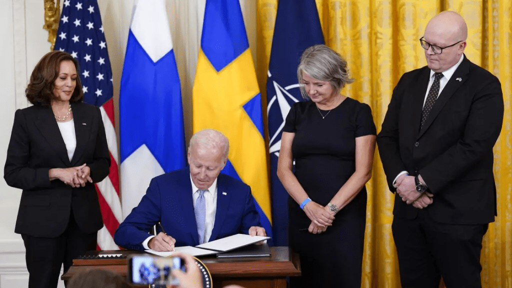 A l’international, entre avril et novembre c’est le conflit russo-ukrainien qui préoccupe le président Biden. Poutine et la Russie ayant échoué à prendre Kiev en quelques semaines, la guerre supposée éclair se transforme en conflit long à l’issue incertaine. Dans ce contexte, le Pentagone pèse de tout son poids économique mais aussi militaire pour aider l’Ukraine à vaincre et à récupérer son territoire. En mai 2022, Biden signe l’Ukraine Democracy Defense Lend-Lease Act, décret qui débloque une aide en matériel militaire et médical pour un montant total de 40 milliards $. Le 1er août, le Pentagone envoie 550 millions $ supplémentaires aux ukrainiens en les fournissant en lance-roquettes HIMARS. A partir de septembre, le rapport de force commence à s’inverser en faveur de l’Ukraine qui regagne du terrain. En parallèle, les sanctions financières contre la Russie sont renforcées fin juin lors du G7 avec la décision de mettre fin à l’importation d’or russe. L’attaque russe a entraîné, par réaction, l’alignement de pays restés jusque là neutres sur la ligne occidentale. La Suède et la Finlande demandent officiellement leur adhésion à l’OTAN le 19 mai lors d’une visite commune à la Maison Blanche. Leur adhésion est formellement ratifiée par Joe Biden le 9 août 2022.