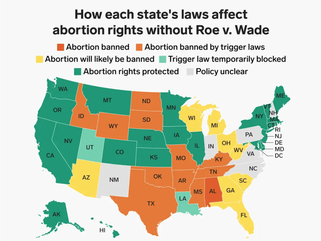 Chaque Etat est donc désormais libre de sanctuariser, d’autoriser, de restreindre ou d’interdire l’avortement (les juges de la Cour Suprême ont refusé d’inscrire le bannissement de l’avortement dans la constitution). A ce jour, seul l’Alabama a banni totalement l’avortement (même dans le cas où la santé de la mère est en danger), 11 autres le bannissent de fait via les trigger laws, des lois qui avaient été votées précédemment mais ne pouvaient être exécutoire qu’une fois la décision fédérale renversée. Dans ces 11 Etats, l’avortement n’est désormais autorisé qu’en cas de danger pour la santé de la mère. 8 Etats supplémentaires envisagent de bannir l’avortement et 5 ont une politique pour l’instant peu claire. Au total, plus de la moitié des Etats pourraient interdire totalement l’avortement. Lors de l’élection de mardi prochain, 5 Etats vont demander aux électeurs de se prononcer sur la question : le Kentucky et le Montana pour le restreindre totalement, le Vermont, la Californie et le Michigan pour l’inscrire comme droit inaliénable. En août, un référendum au Kansas, Etat très conservateur, a donné un résultat surprenant, l’interdiction de l’avortement a été rejeté par 59% des électeurs.