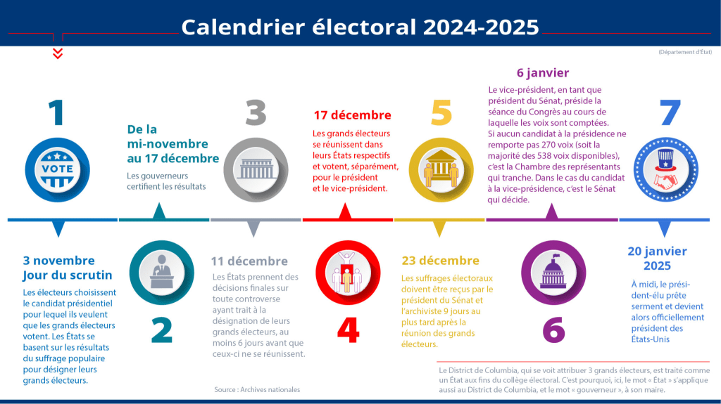 Dans chaque État, les électeurs ne votent pas directement pour le président républicain ou démocrate, mais pour choisir des grands électeurs au nombre de 538. Les grands électeurs élisent le président à la majorité absolue, le premier lundi qui suit le deuxième mercredi de décembre (vous suivez toujours ?). Ensuite, le président prend ses fonctions lors de l’inauguration le 20 janvier de l’année suivante à midi.
