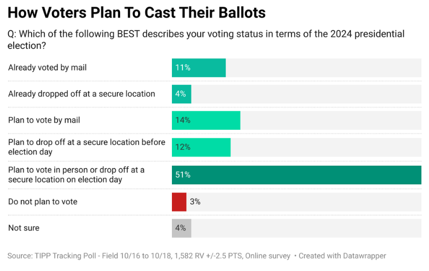 Alors que l’élection présidentielle approche, des millions d’Américains ont déjà voté par correspondance ou en personne en anticipé. Alors que près de 3/4 des électeurs avaient voté avant le jour J en 2020, seulement un peu plus de 50% des électeurs auront déjà voté cette année. Contrairement à l’élection précédente, les Républicains encouragent leurs électeurs à voter le plus tôt possible et ont adopté une stratégie tout aussi agressive que les démocrates pour récolter des bulletins de vote. Certains états fournissent des informations sur les électeurs ayant déjà voté (âge, sexe, appartenance ethnique, affiliation politique, etc), ce qui offre des indications sur les tendances actuelles.