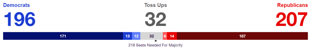La situation est incertaine pour la Chambre des Représentants, actuellement contrôlée par les Républicains (222 élus contre 213 pour les Démocrates). Une trentaine de sièges sont en jeu et les Démocrates ont de bonnes chances d’en gagner quelques-uns. Cette élection étant souvent corrélée au vainqueur de la présidentielle, Trump pourrait avoir les deux chambres s’il est élu tandis que Harris n’aurait la majorité qu’à la Chambre des Représentants si elle gagne.