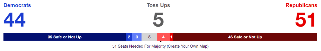 Le Sénat compte actuellement 51 élus démocrates et 49 élus républicains. Cette année, davantage de sièges démocrates sont en jeu et les intentions de vote sont peu favorables. Les pronostics s’accordent à dire que le Sénat devrait passer aux républicains, avec un gain de 2 à 6 sièges supplémentaires.