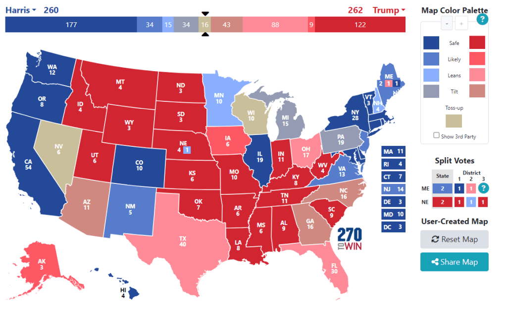 Les tendances montrent une mobilisation forte des deux camps. Les électeurs affiliés aux républicains votent massivement dans les Etats de la Sun Belt tandis que les démocrates se mobilisent en Pennsylvanie. Les femmes votent davantage, mais la participation des jeunes et des afro-américains diminue. Certains analystes font des conjectures que j’ai représentées dans la carte électorale ci-dessous. Une chose est sûre : l’élection sera très serrée.