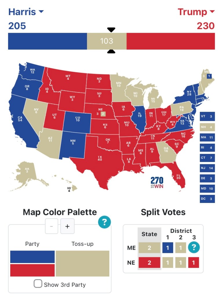 5h05 : Donald Trump remporte le Kansas et l’Iowa (le sondage Selzer était bien à côté de la plaque). Kamala Harris remporte le District of Columbia et le district 1 du Maine.