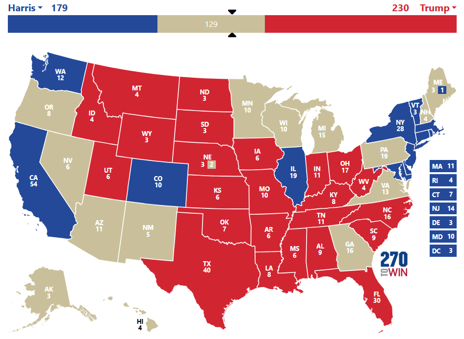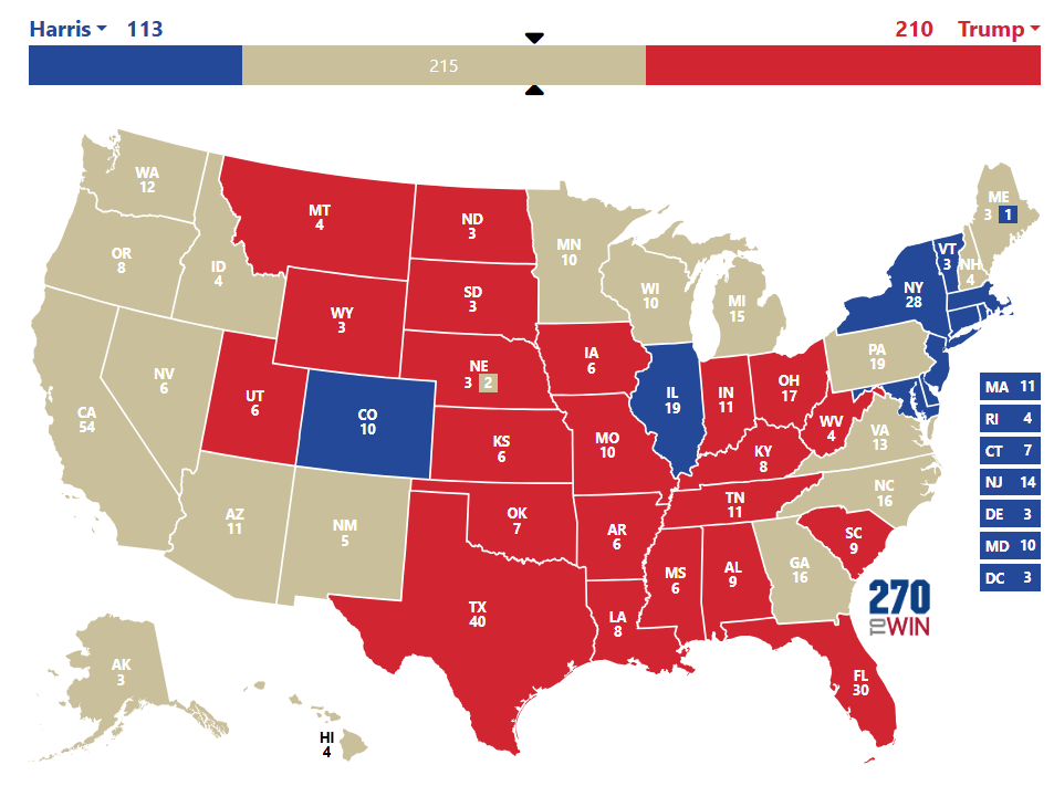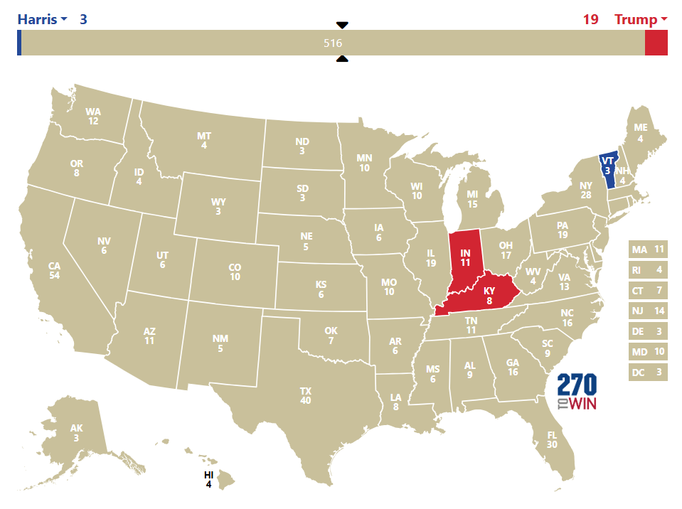 1h10 : Donald Trump remporte le Kentucky et l’Indiana qui représentent 19 Grands Electeurs. Harris remporte 3 Grands Electeurs dans le Vermont. Ce sont des états que chaque candidat devait remporter.