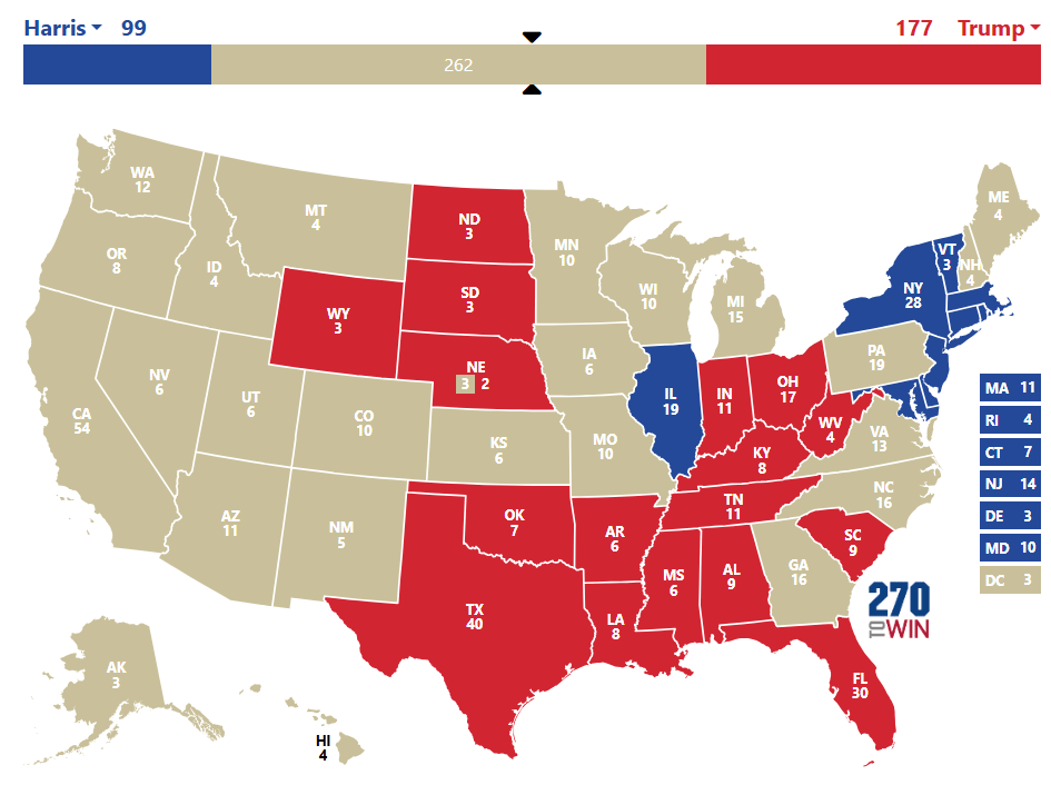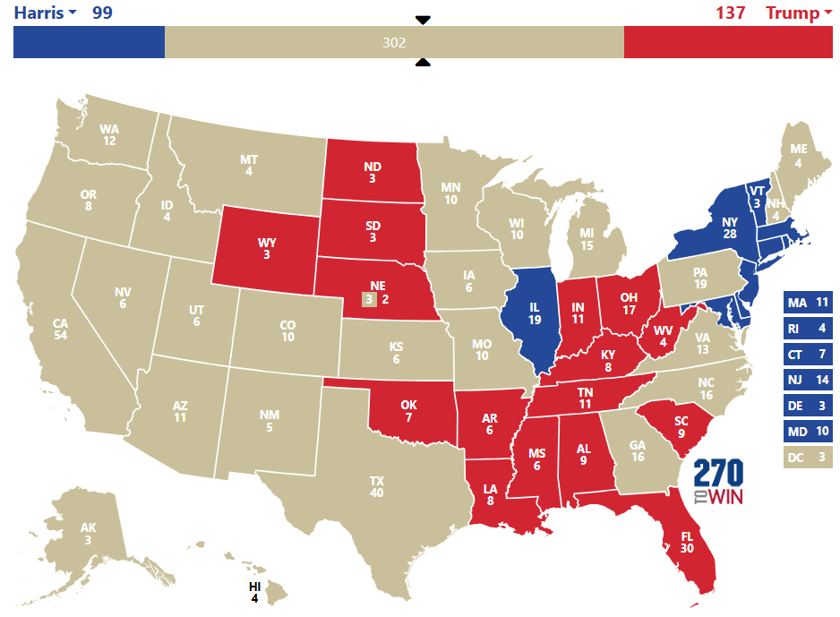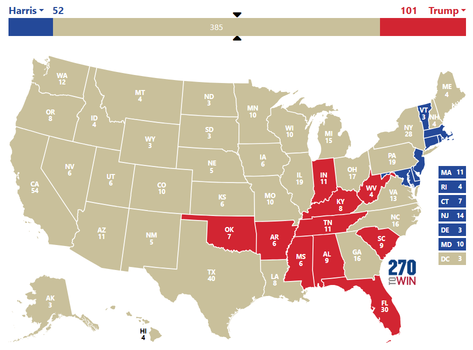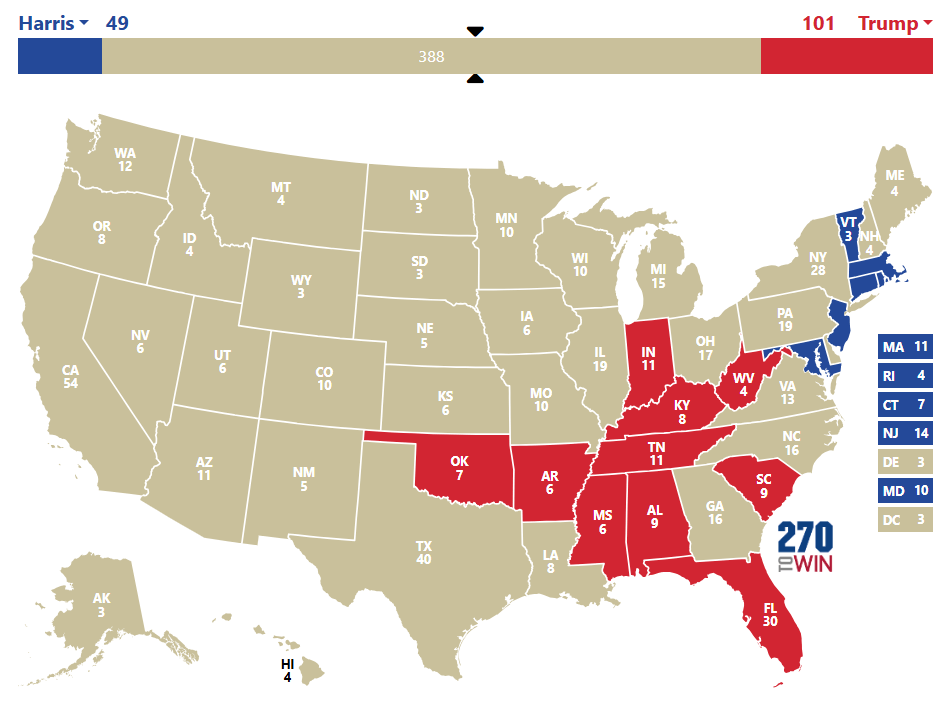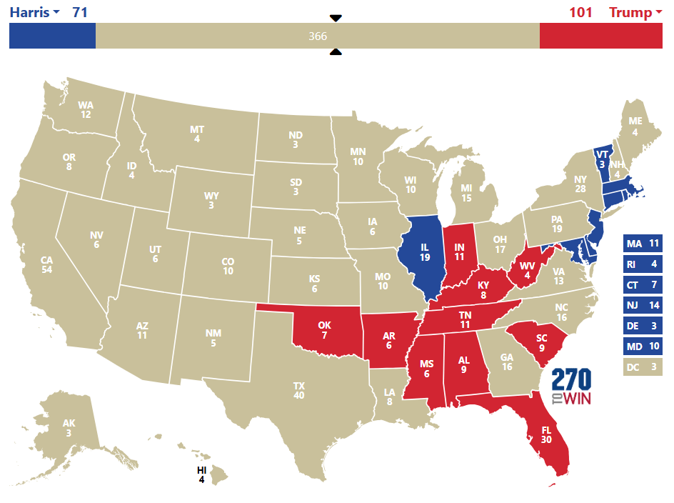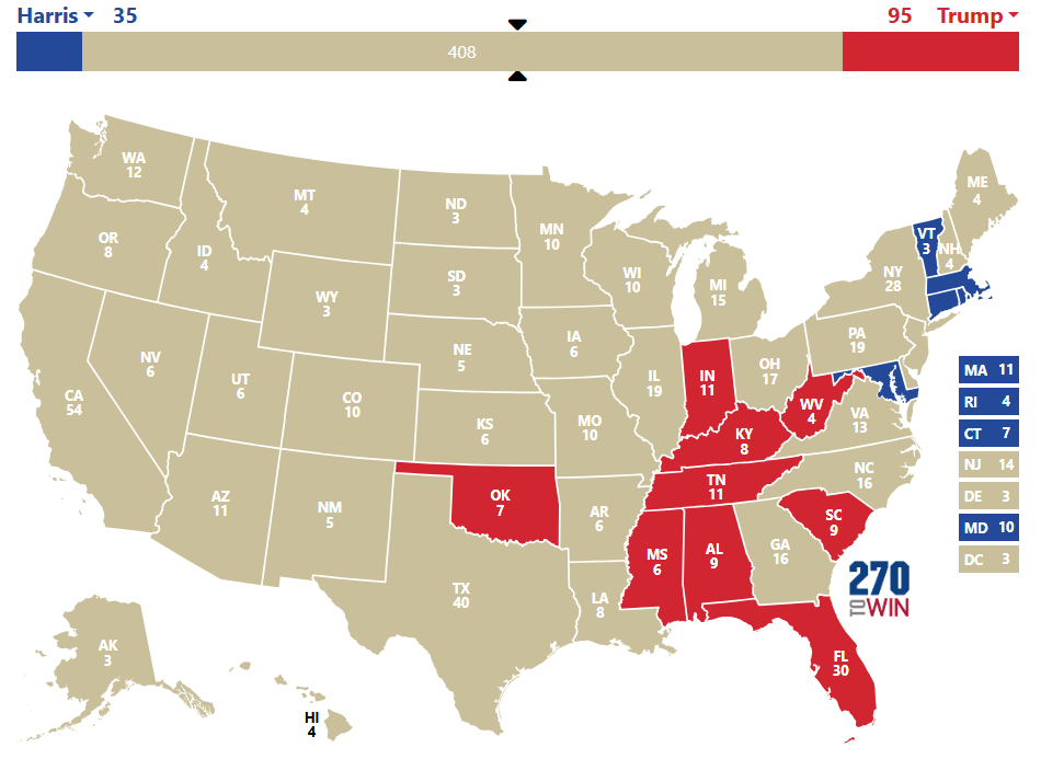 2h11 : Kamala Harris remporte les états du Maryland, Massachussetts, Rhode Island et Connecticut. Trump remporte la Floride (déjà), la Caroline du Sud, le Tennessee, l’Alabama, l’Oklahoma et le Mississippi. Sur la carte, tout est normal pour l’instant mais Trump a écrabouillé Harris en Floride.