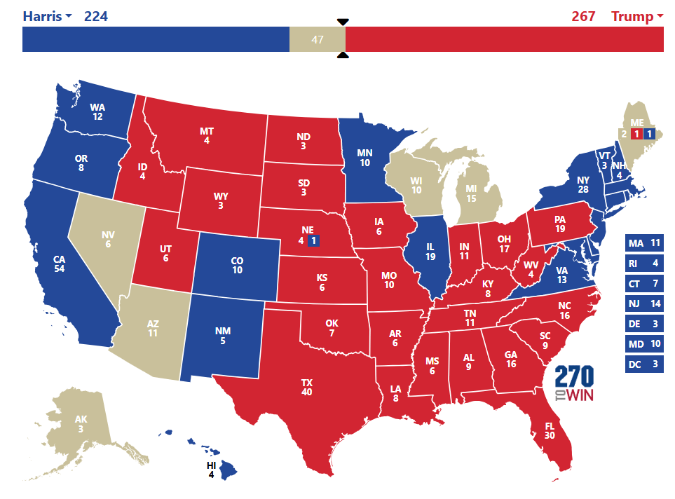 9h05 : Discours interminable de victoire de Donald Trump qui m’a presque endormi. Entre temps, la Pennsylvanie est officiellement remportée par Trump et le Minnesota par Harris. Il ne manque plus que 3 grands électeurs pour que Donald Trump devienne officiellement président. Ce sera fait d’ici mon réveil ! A demain pour finir ce live !